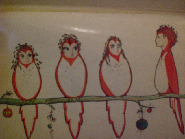 For Christmas a little art.  Many moons ago before I was born, my mother made a Christmas card for her mother.  The card illustrated the Twelve Days of Christmas using my grandmother’s five children: my mom (who died at 45), my uncle Barry (who died at 22), my uncle Scott (who spent most of his life in group homes and is now missing–thank you State of Florida), my aunt Susan, and my aunt Genie.  Susan and Genie were adopted by my grandmother after their father married my grandmother, embezzled money meant for the families of victims of an Alaskan earthquake, and promptly disappeared.  For reasons unknown to me, my aunts are not part of my life.