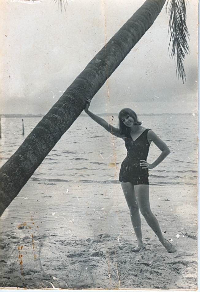 I love this photo, too. Great smile, great pose, and a great little detail in the… uh… the footies or whatever was on her feet. Also love that it’s in B&W, when convention would say that a beach scene virtually demands color, if color is available; B&W beach scenes strike me as almost ominous. E.g. is that a far shore on the horizon? a gigantic storm front? a tsunami?