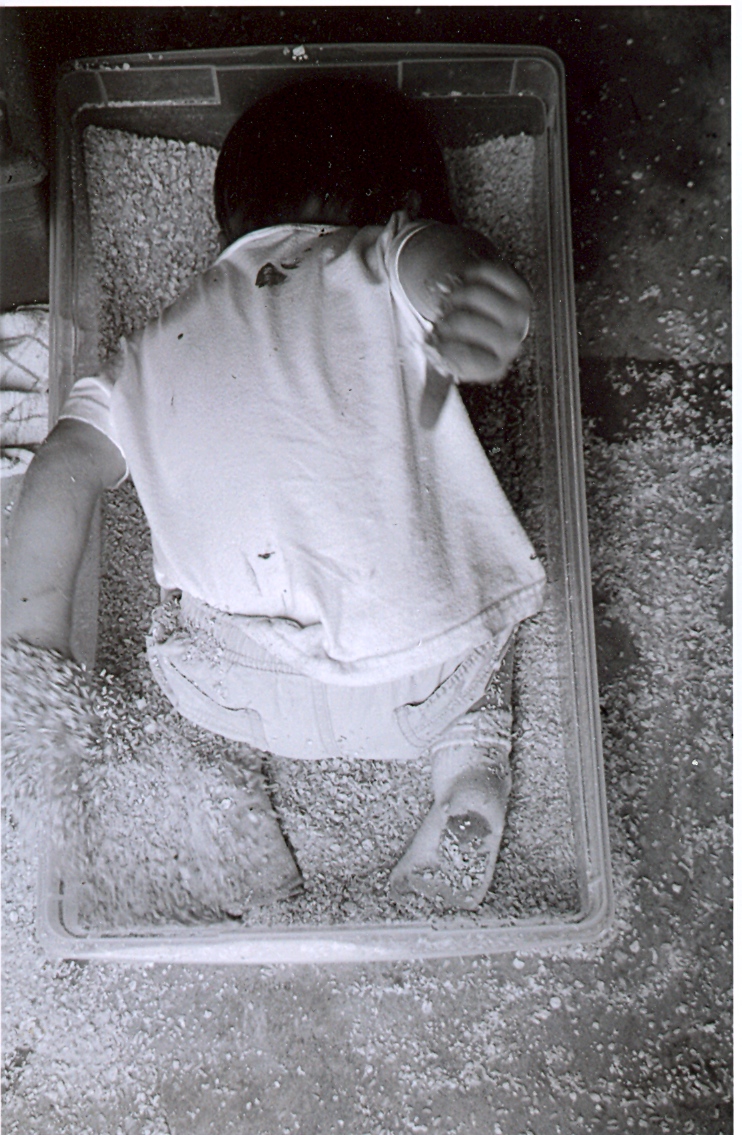 a kiddo hiding in oatmeal and rice